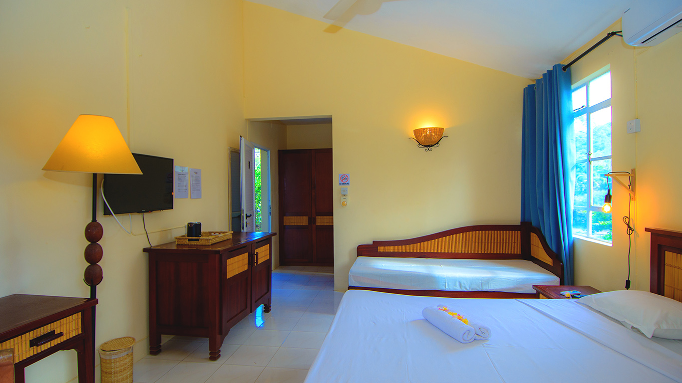 Chaque séjour dans cet établissement, loin des standards hôteliers classiques, se transforme en véritable expérience. Confortables et baignées de teintes douces, les chambres, au nombre d’une dizaine, se répartissent entre un bâtiment principal, situé au‑dessus de la réception et idéal pour les familles, et un second bâtiment au charme authentique, qui séduira les couples. Elles offrent tout le confort nécessaire pour se détendre après une journée à explorer les trésors de l’île, que ce soit en savourant un moment de calme au bord de la piscine ou en laissant filer le temps depuis la terrasse de votre chambre, tout en contemplant le petit jardin.