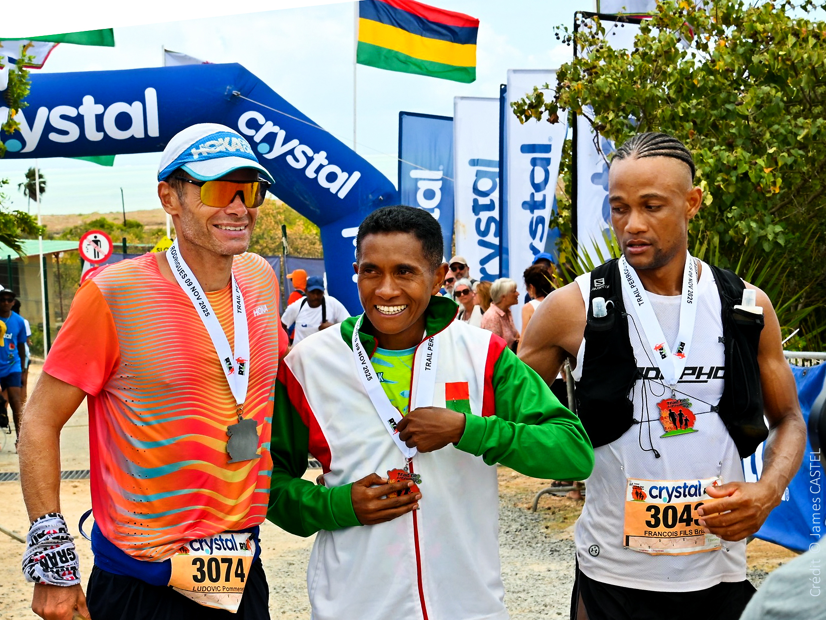 ◾️ Trail Perroquet (52 km) : victoire éclatante de Mamie Andrianirina (Madagascar, au centre), devant Ludovic Pommeret (France, dossard 3074) et Brian François Fils (Rodrigues). © James Castel